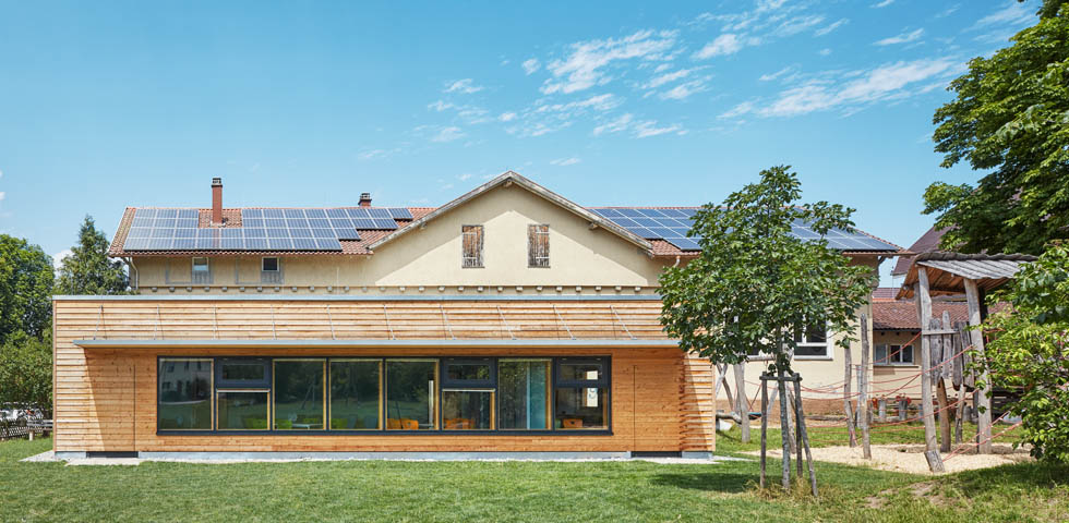 Die Ludwig-Krapf-Grundschule im Tübinger Ortsteil Derendingen wurde im Rahmen der Ganztagesbetreuung vergrößert. Als Alternative zu einer Containerlösung entstand eine Mensa mit 50 Sitzplätzen, mit einer Küche, einem separaten Betreuungsraum und Nebenräumen. Das vorhandene Bestandsgebäude wurde um einen eingeschossigen Kubus in Richtung Süden erweitert. Der Neubau wurde über ein großes Vordach mit dem Bestand verbunden. An der Nordseite, zum Bestand hin, ist der Baukörper geschlossen. Der Saal orientiert sich nach Süden, ein großes Fenster rahmt den Blick in die Umgebung. Über dem Fenster, in der ganzen Länge, ist ein auskragender feststehender Sonnenschutz angebracht.